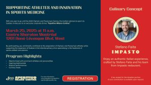 With one year to go before the 2026 Olympic and Paralympic Games, the Institut national du sport du Québec invites you to an exclusive corporate lunch: Aperitivo Milano-Cortina. Not only will you contribute directly to the preparation of Olympic and Paralympic athletes, but you will also support the expansion of the first interdisciplinary clinic in Quebec specializing in the treatment of concussions in athletes.