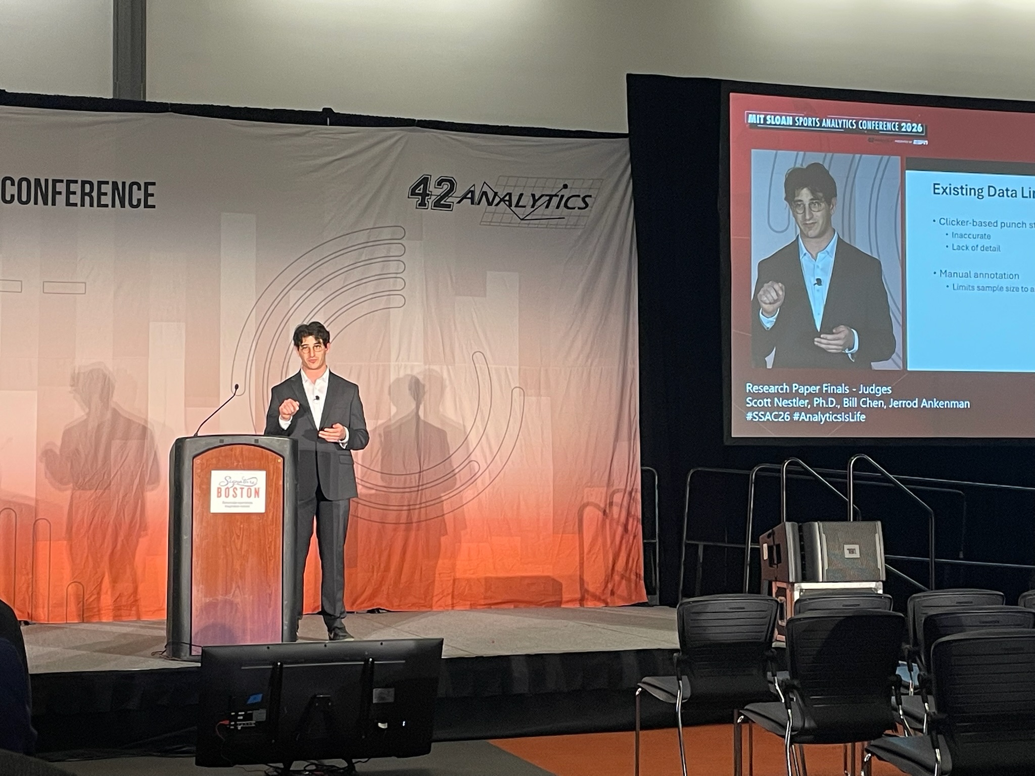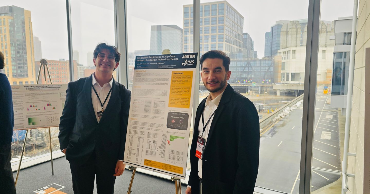 La recherche, intitulée Interpretable Prediction and Large-Scale Analysis of Judging in Professional Boxing a été sélectionnée parmi les finalistes de l’édition 2026 de la MIT Sloan Sports Analytics Conference, une des conférences les plus prestigieuses au monde en ce qui a trait à l’analyse sportive. Parmi 197 candidatures, la recherche a été l’une des sept à être présentées durant la conférence. Elle a été co-dirigée par deux spécialistes de l’INS Québec, soit Thomas Romeas, chef recherche et innovation, et Mathieu Charbonneau, biomécanicien du sport, ainsi que deux experts de la compagnie Jabbr, le stagiaire en recherche Mason duBoef et le président-directeur général Allan Svejstrup Nielsen.